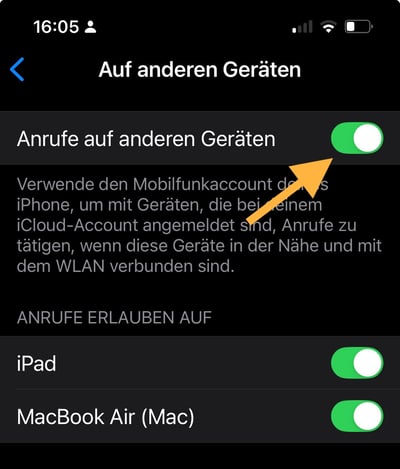 Aktiviere "Anrufe auf anderen Geräten" und stelle sicher, dass dein Mac in der Liste ausgewählt ist.