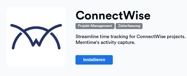 3. Du wirst zum Memtime-Marktplatz weitergeleitet. Suche dort nach ConnectWise und klicke auf Installieren.