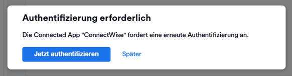 2. Wähle ConnectWise aus der Connected Apps-Liste und klicke auf Authentifizieren. Die Authentifizierung wird ebenfalls automatisch angefordert.