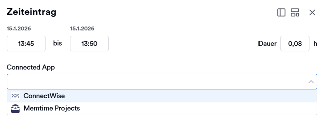 Im Zeiteinträge-Fenster kannst du jetzt ConnectWise als Connected App auswählen.