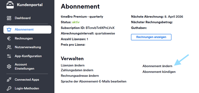Dort kannst du sowohl deine Rechnungs- und Zahlungsdaten als auch dein Abonnement verwalten.