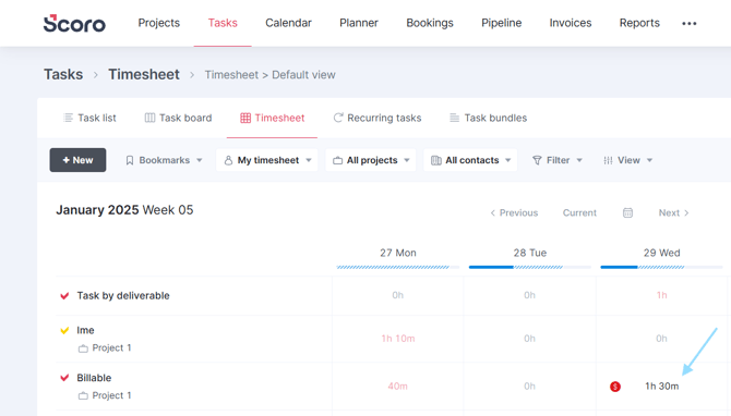 3. Melde dich in deinem Scoro-Konto an und gehe zu Tasks → Timesheet oder einer beliebigen Aufgabe mit Zeiteinträgen, um die von Memtime synchronisierten Zeiteinträge anzusehen.