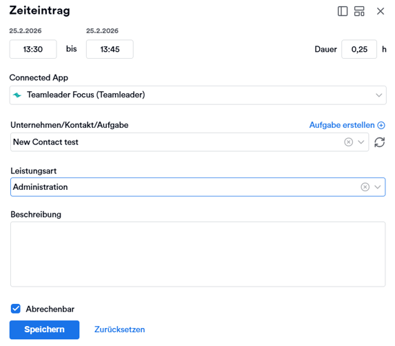 Im Zeiteinträge-Fenster kannst du jetzt Teamleader Focus als Connected App auswählen.