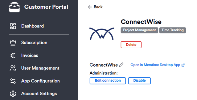 Connected Apps → ConnectWise → Manage → Edit Connection
