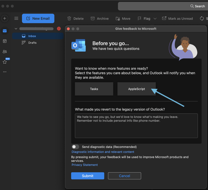 When you’re prompted to explain why you're leaving the new Outlook, please select “AppleScript” as the reason. This helps gather feedback and signals the need for this feature, potentially speeding up the update process.