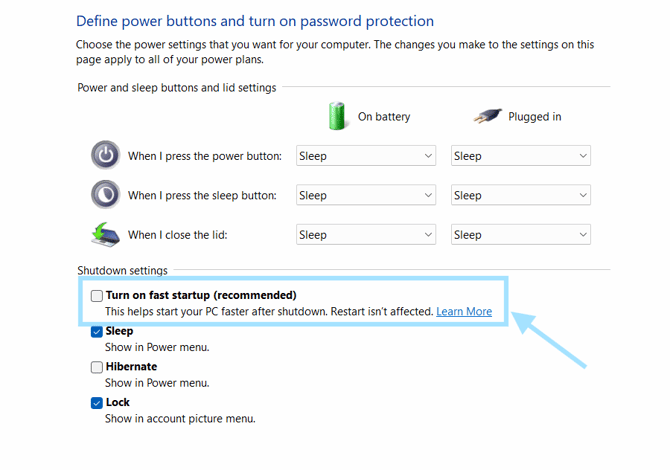 Uncheck the box next to Turn on fast startup (recommended), and click Save Changes.
