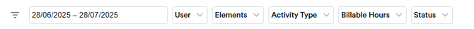 Exports Time Entries by date, user, activity type, type of work, and comments, based on your selected filters and date range.