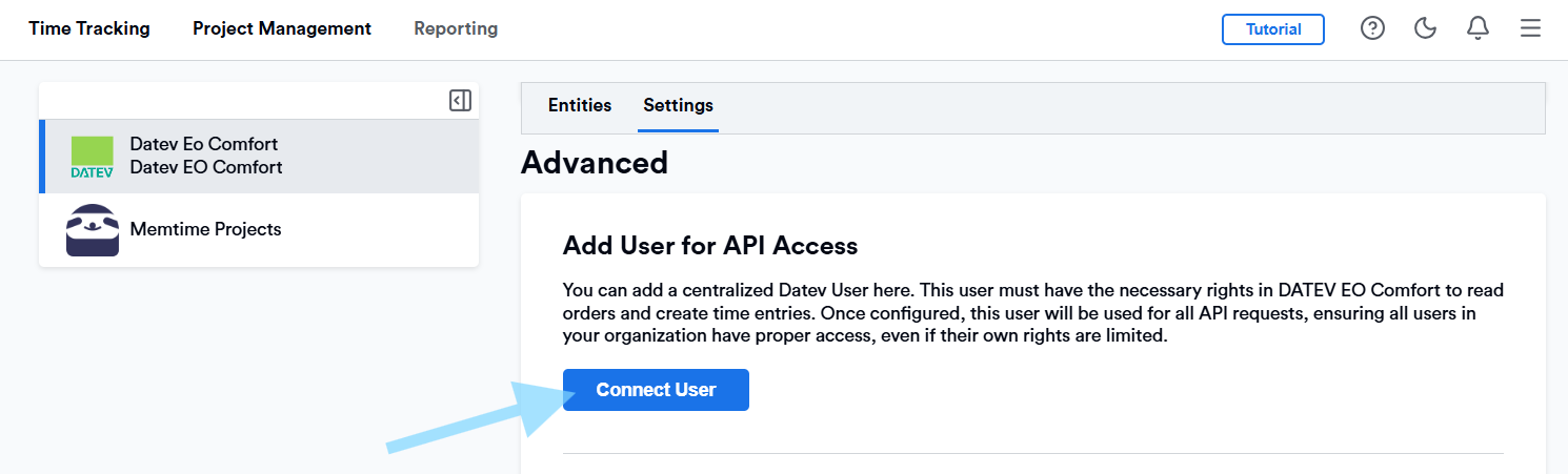 After successful authentication, your DATEV entities are automatically imported into Memtime.