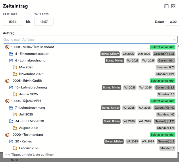 1. Open DATEV and go to the order that you want to book time on.