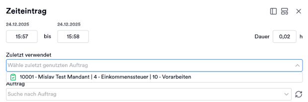 If you use DATEV EO Comfort, Memtime automatically imports your clients and orders from DATEV. When creating time entries, you only need to select what you worked on.