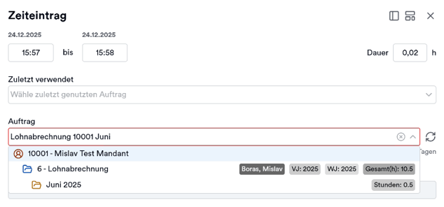 For example, entering an order name, number, and a year, filters the list more precisely and speeds up your workflow when creating new entries.