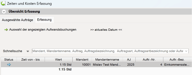 In DATEV EO Comfort, the entry appears directly in the project overview with service assignment, duration, employee, and description.