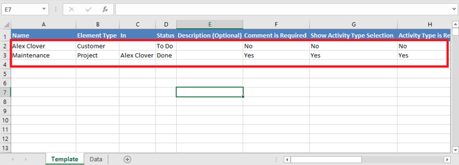 3. En la pestaña Template, ingresa los nombres de tus Clientes, Proyectos y Tareas, especifica sus elementos padres y completa la información requerida, como Tipos de Actividad, Opciones de Facturación y otros campos relevantes.